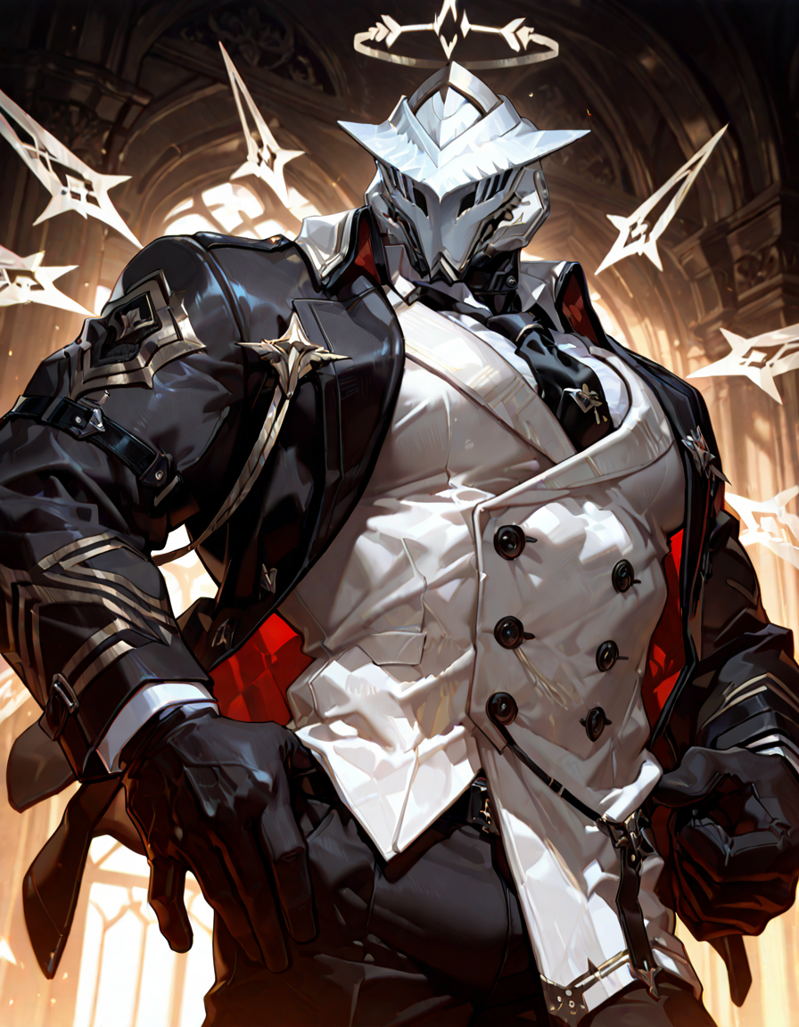 经典元素:饰带、装甲靴、缎带徽章、黑色腰带、胸甲、板甲、护手、胫甲、光环、头盔、腿甲、肩甲、护肩、红色胯帘、红色斗篷、红色肩章、小臂甲、白色盔甲、能量之翼、翅膀,