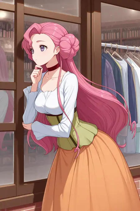 dflt outfit, pink strapless dress, cleavage, white shrug (clothing), long sleeves, neck flower, red neck ribbon, red arm strap, arm flower, dress flower, skirt under dress, white long skirt, pink rose