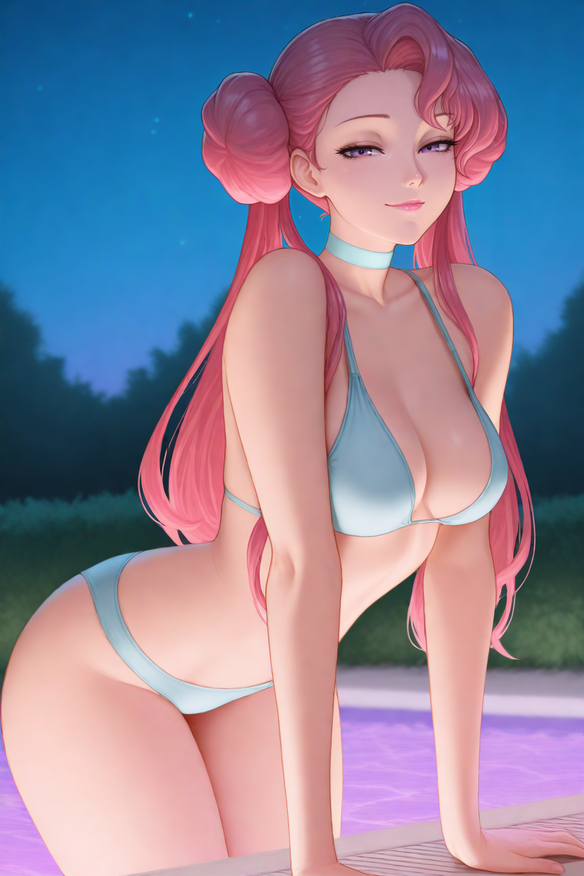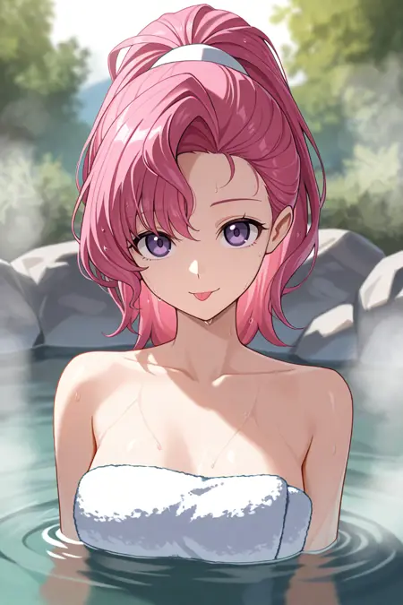 euphy, 1girl, pink hair, purple eyes, double bun, asymmetrical bangs, high ponytail, pink lipstick