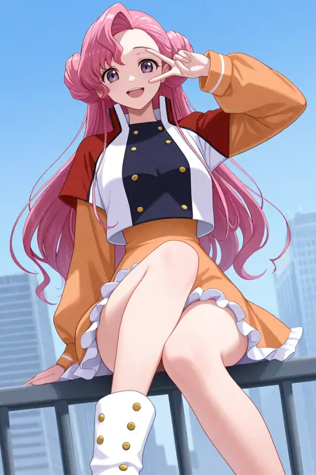 undercover outfit, multicolored jacket, popped collar, white jacket, gold buttons, orange short dress, frilled dress, long sleevess, sunglasses, multicolored headwear, red shako cap, white ankle boots