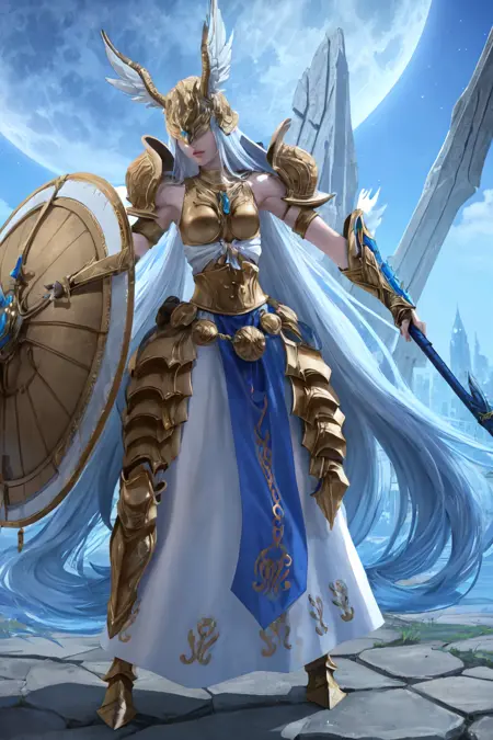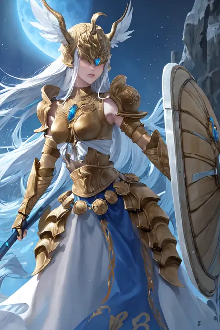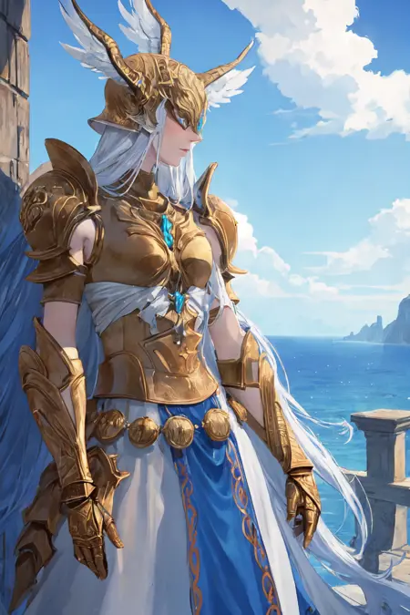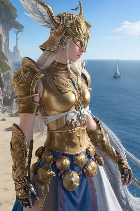 衣装:「翼付きヘルメット、目を覆うヘルメット、黄金の鎧、肩甲板、胸甲、鎧のドレス、手甲、ベルト」