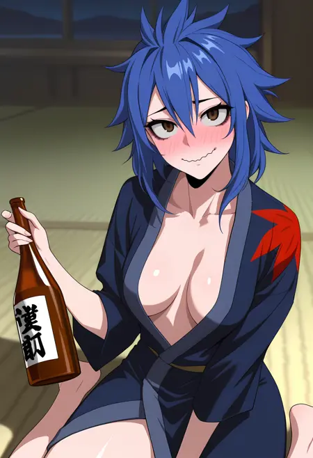 lvymcgrdkmn, brown eyes, blue hair, medium hair, messy hair, spiked hair, hair slicked back, sidelocks, blue kimono, print kimono, brown sash,