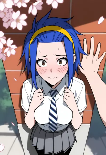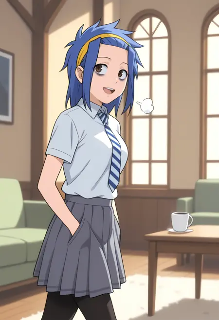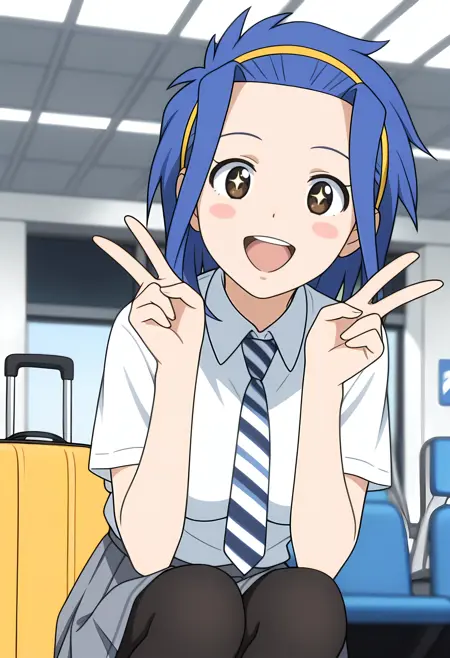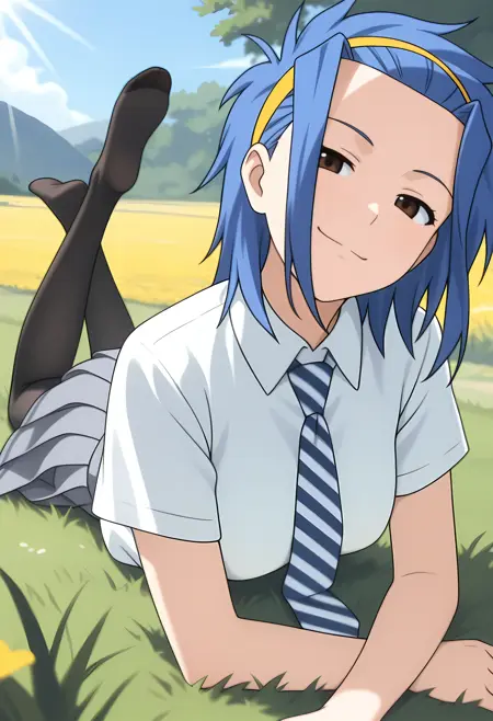 lvymcgrdksl, brown eyes, blue hair, medium hair, spiked hair, hair slicked back, sidelocks, yellow headband, white shirt, collared shirt, striped necktie, short sleeves, grey skirt, pleated skirt, black pantyhose,
