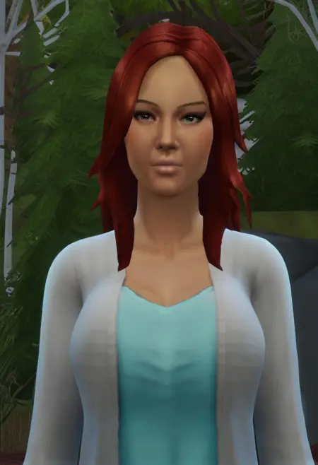 Sims4KatrinaCaliente, 1girl, breasts, large breasts, dark-skinned female, red hair, long hair, blue eyes, green eyes