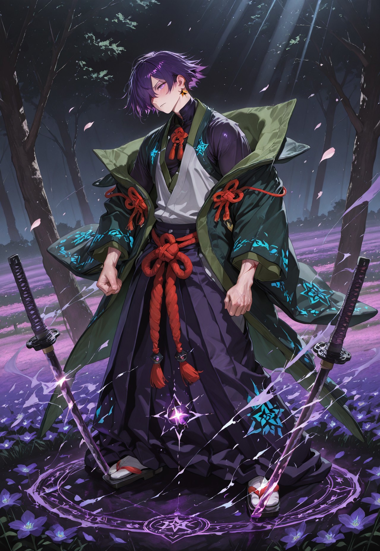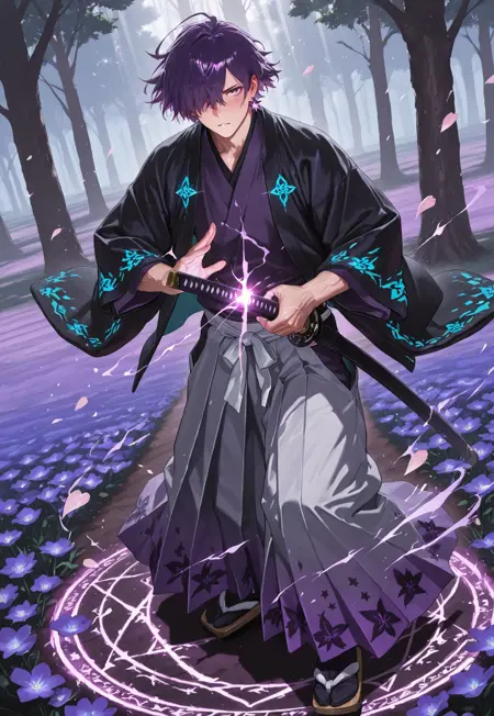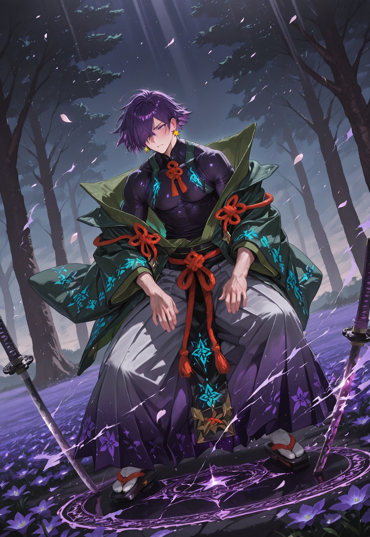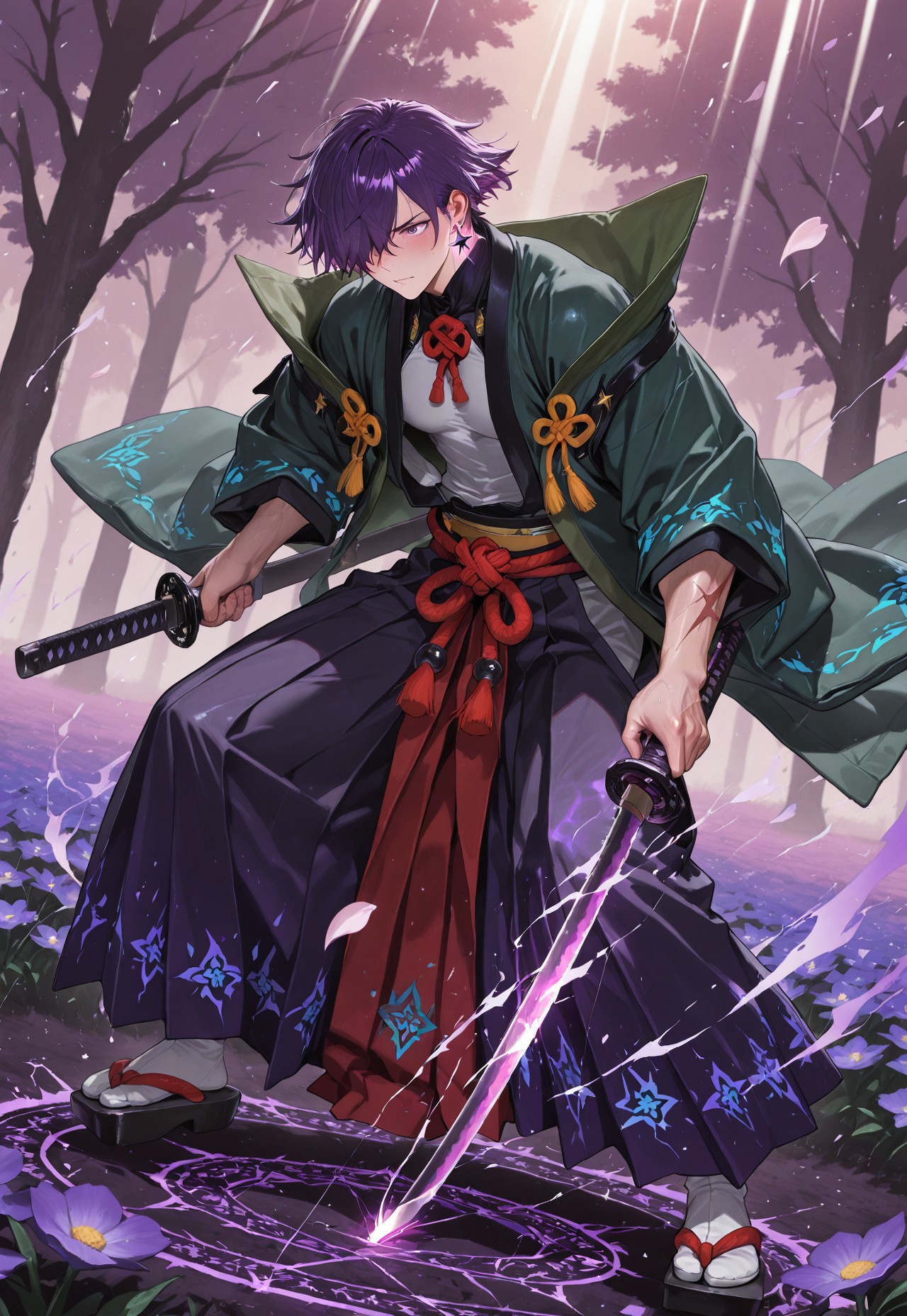 1boy, purple hair, purple eyes, hair over one eye, short hair,
