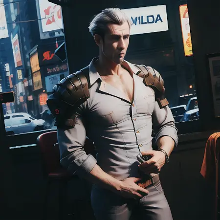 다른 프롬프트: 회색 머리, 트렌치코트, 빨간 눈, 수염, 성숙한 남성