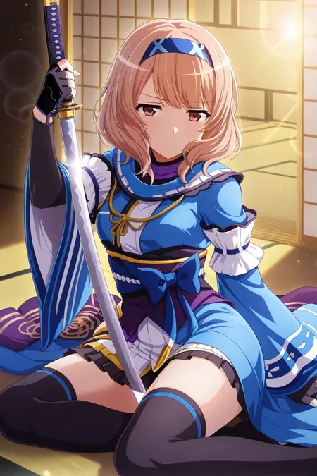 yuyuko, 1girl, solo, shoulder armor, armor, hair ornament, japanese clothes, brown eyes, sash, looking at viewer, japanese armor, frown, kimono, blush, obi, skirt, blonde hair, light brown hair, ribbon trim, pauldrons, bangs, pleated skirt, red kimono, stage outfit