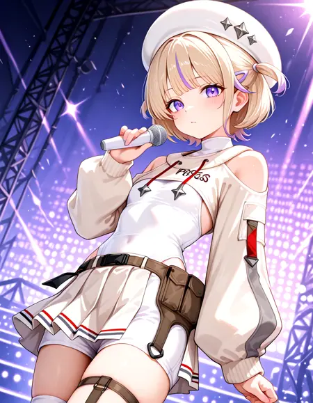 white beret, hat ornament, long sleeves, shrug\(clothing\), turtleneck, shoulder cutout, white leotard, leotard under clothes, white pleated skirt, black belt, belt pouch, white shorts, shorts under skirt, thigh strap, white thighhigh, single thighhigh, asymmetrical legwear, nail polish, white footwear, sneakers