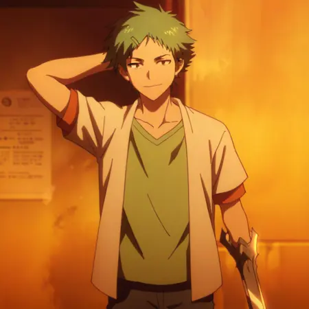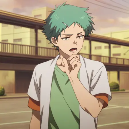 提示:男性,绿发,黑眼,发夹,绿色衬衫,白色衬衫,衣物敞开,短袖,裤子,鞋子,室内(电脑房/多台电视),室内(走廊/天花板/天花板灯/门/窗),室内(VIP室),室外(城市/天空/建筑/道路),室外(屋顶/天空/云/建筑),室外(停车场/树),室外(小巷),室外(公园/天空/云/树),波点/波点背景/蓝色背景