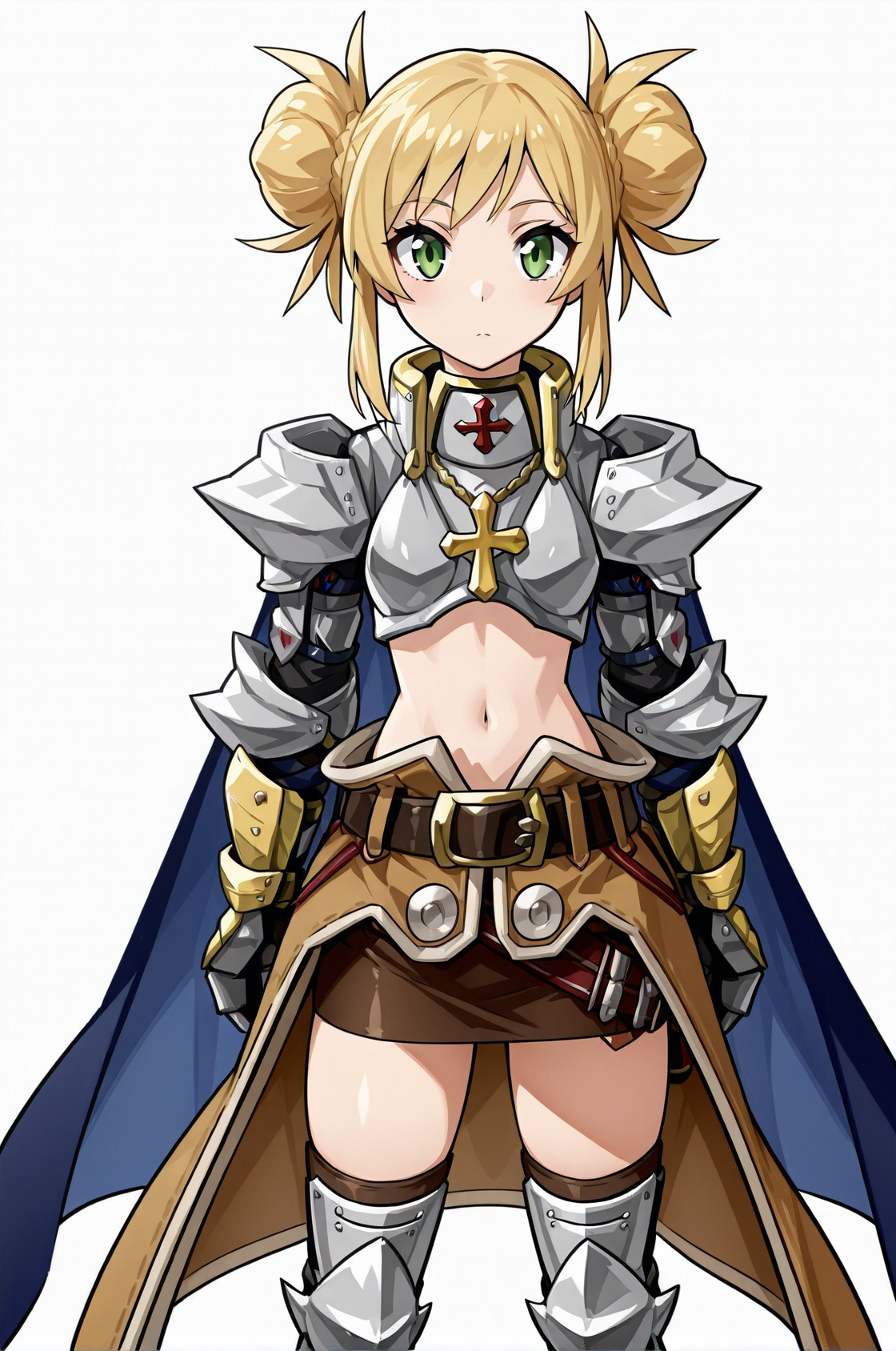 prompt: paladinRO, midriff, navel, blue cape, golden gauntlets, miniskirt, pencil skirt, cross, belt, silver pauldrons, silver breastplate, gorget, cross necklace, waist cape, thigh boots, greaves