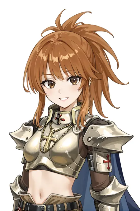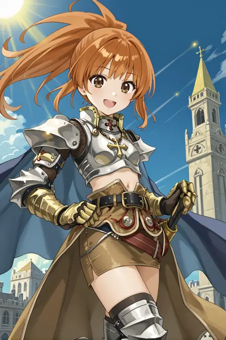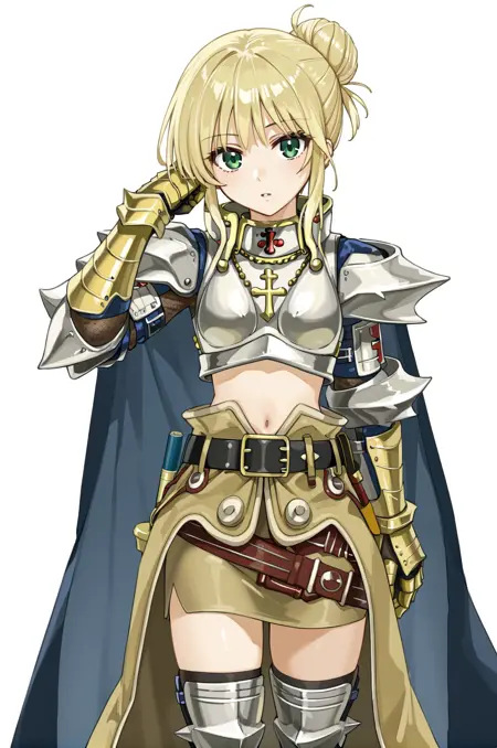 prompt: paladinRO, midriff, navel, blue cape, golden gauntlets, miniskirt, pencil skirt, cross, belt, silver pauldrons, silver breastplate, gorget, cross necklace, waist cape, thigh boots, greaves