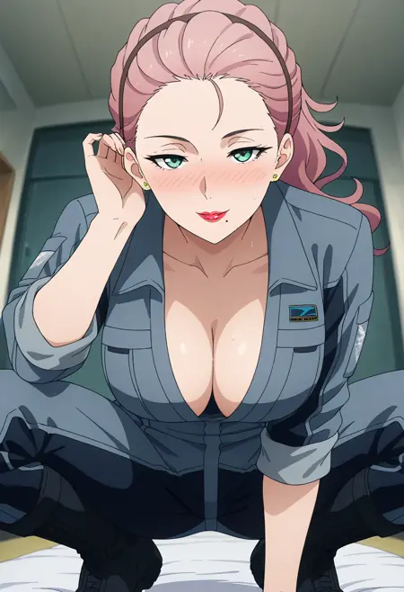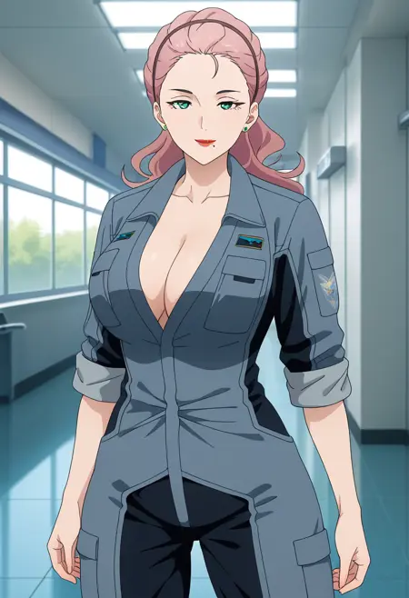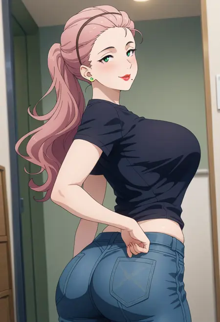 - shelleyww, green eyes, pink hair, long hair, ponytail, mole under mouth, lipstick, earrings, large breasts,