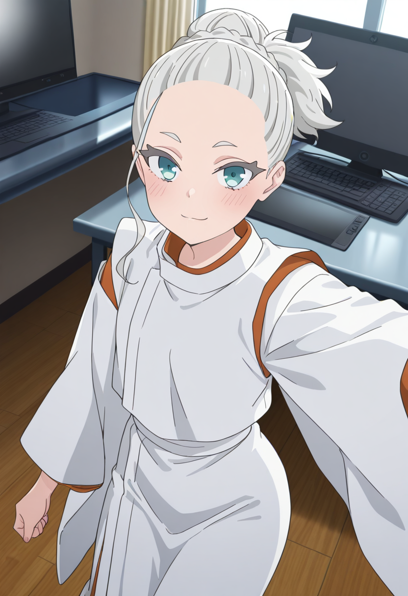 sonia_yanagi,1girl,solo,grey hair,aqua eyes,forehead,school uniform,white shirt,collared shirt,sleeves rolled up,red necktie,sweater vest,brown skirt,pleated skirt,white socks,shoes,brown footwear,loafers,