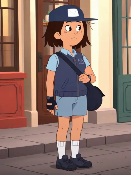 衣装: "fingerless glove, wristwatch, baseball cap, short sleeve shirt, vest, shorts, socks, sneakers, mail bag"