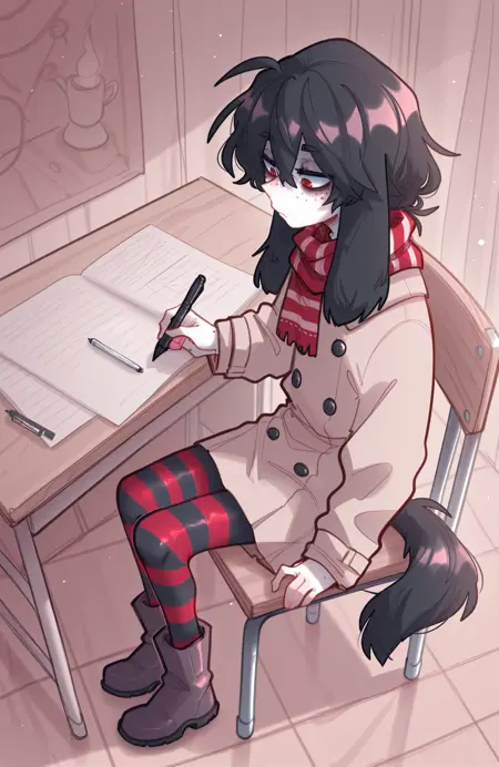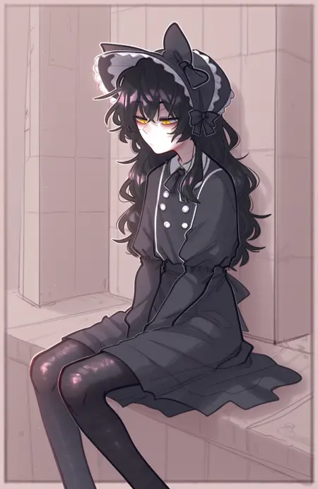 Blind Girl: sophie \(popopoka\), freckles, black hair, ahoge, short hair, grey eyes