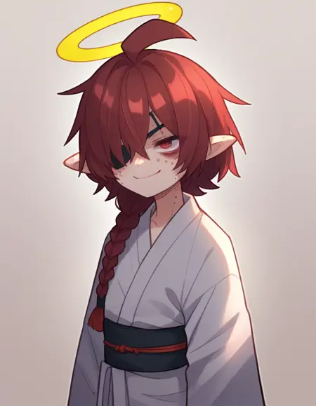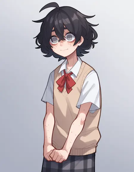 Blind Girl: sophie \(popopoka\), freckles, black hair, ahoge, short hair, grey eyes