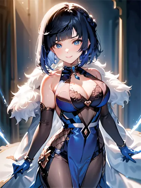 触发词:yelan,1girl,,green eyes,blue hair,multicolored hair,bangs,blunt bangs,earrings,jacket,