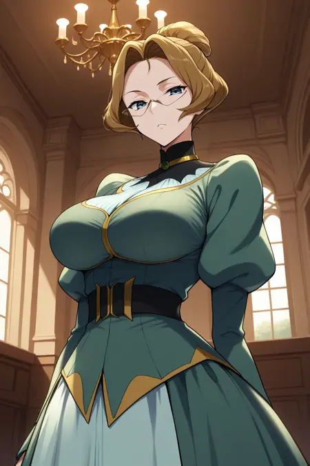 添加 "眼镜,黑色领圈,绿色裙子,朱丽叶袖,黑色腰带" 以呈现她的典型形象。