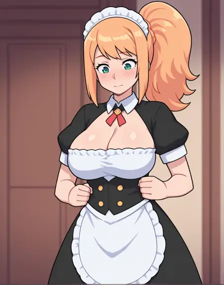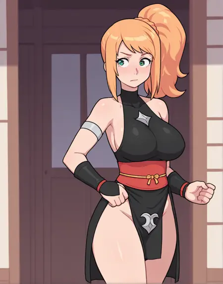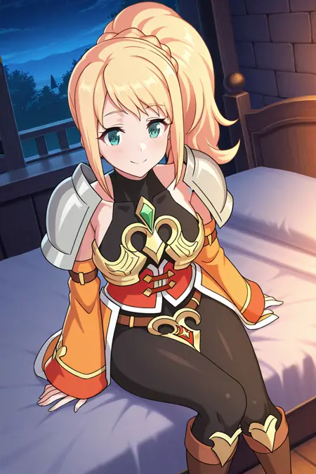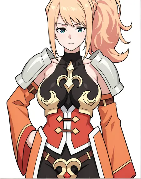 プロンプト: Luckless-Liver020、金髪、緑の目、長い髪、長い袖、広い袖、分離した袖、編み込み、高いポニーテール、サイドポニーテール、茶色の靴、ベルト、黒のパンティストッキング、肩甲板、パウルドロン、胸甲、ボディスーツ、鎖骨カバー、装飾、オレンジ色の袖、オレンジ色のコルセット