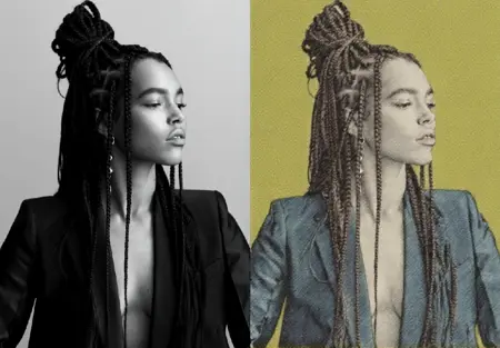 동일한 장면을 양쪽에 나란히 보여주는 이중 이미지. 오른쪽은 왼쪽과 동일한 장면이지만 "당신의 편집"(prostyle 포함, 단순히 편집 내용을 입력하세요)