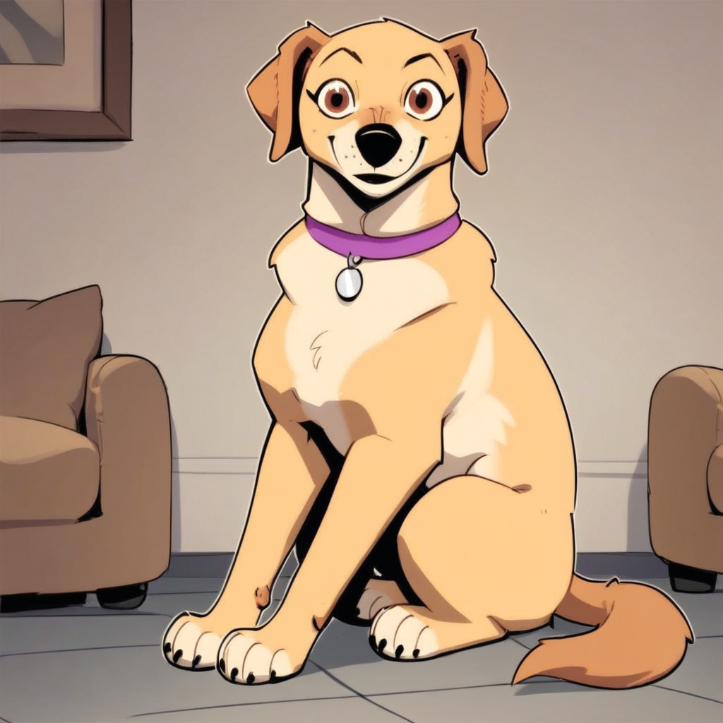 dog, Labrador retriever, yellow fur, brown eyes, black nose, dog tail, dog ears, purple collar,