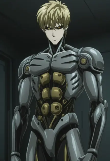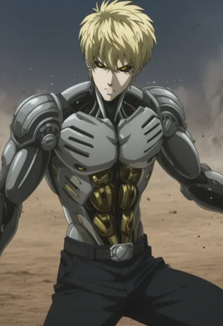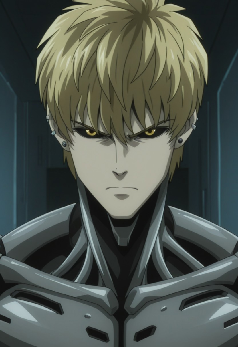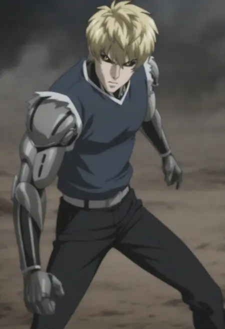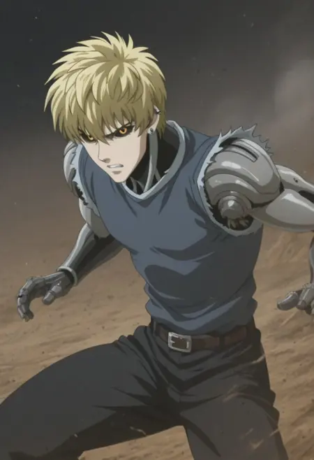 Genos, blonde hair, black sclera, yellow iris, ear piercings, cyborg body, sleeveless shirt, belt, black pants, black shoes