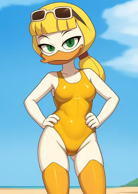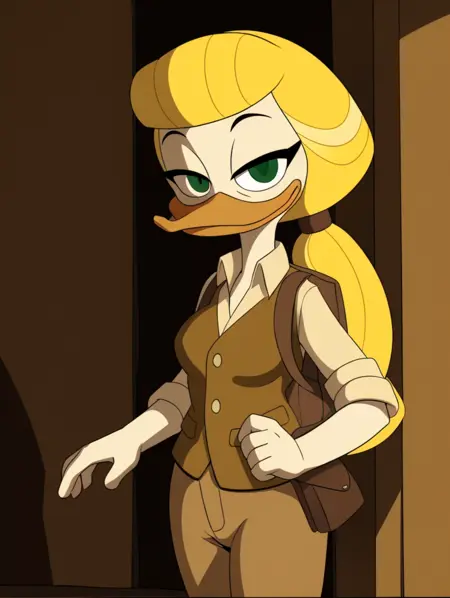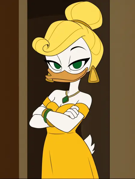 goldie o'gilt, ducktales, beak, duck, green eyes, eyebrows, blonde hair, mature female, eye bags, eyelashes, scut tail, white skin, orange legs, webbed feet