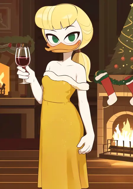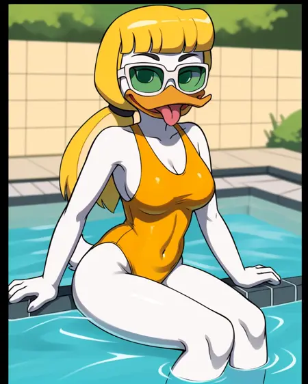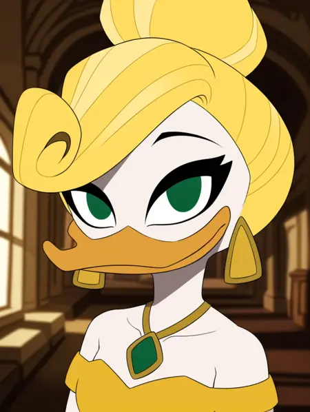 goldie o'gilt, ducktales, beak, duck, green eyes, eyebrows, blonde hair, mature female, eye bags, eyelashes, scut tail, white skin, orange legs, webbed feet