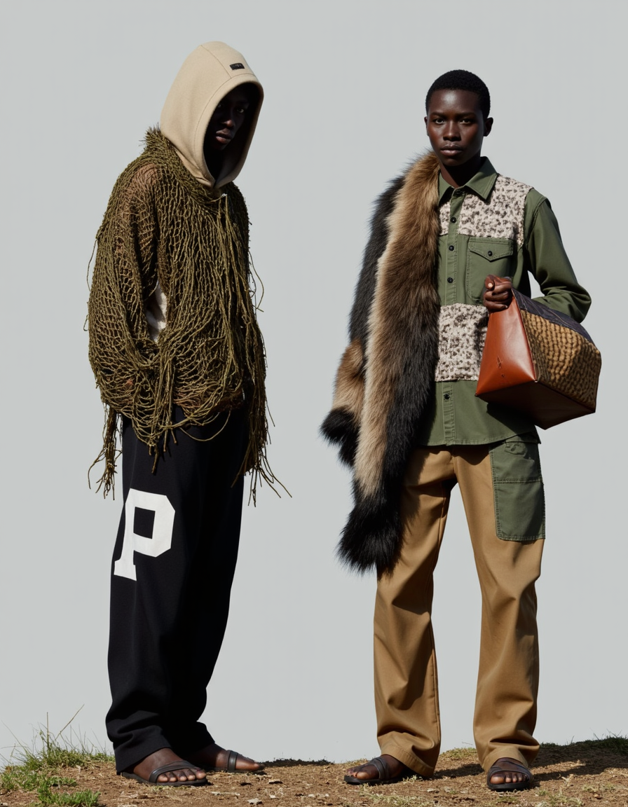 Conceptual fashion based on the creative assembly of recycled objects and materials, in the context of a dystopian or post-apocalyptic world. NOT ONLY EARTH-SAND PONCHOS! This is the search of create images or descriptions where something recognizable (recycled) appears mutated, maintaining traces of its original function but reconfigured for another use.