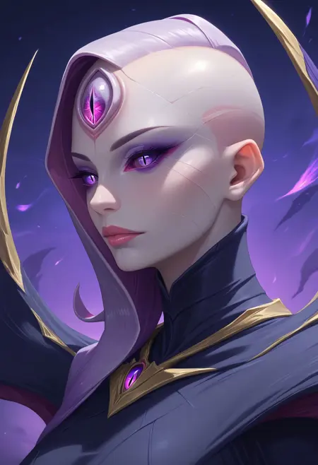 基础提示:bel'veth, 1girl, 第三只眼, 紫色眼睛, 彩色巩膜, 竖瞳, 黑色连衣裙, 大乳房, 剃发, 灰色皮肤