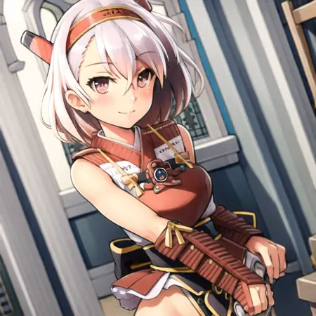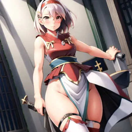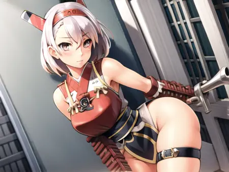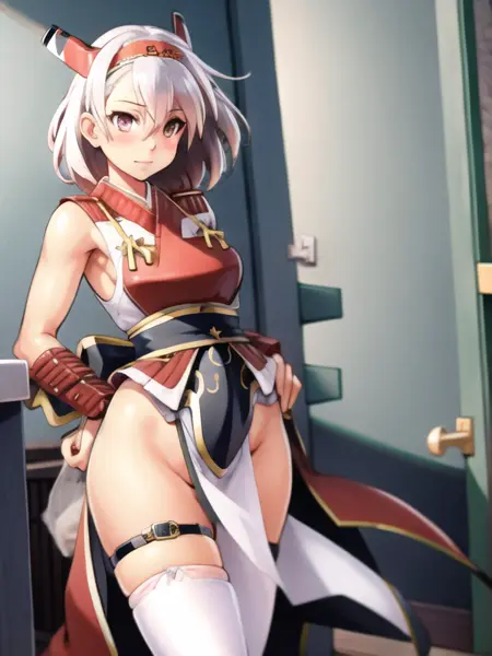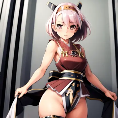 Aizuwakamatu,pink hair, short hair,hair ornament, hairband,pink japanese clothes,japanese armor, pink long pelvic curtain,thigh strap,white thighhighs, geta,kote,pendant choker,