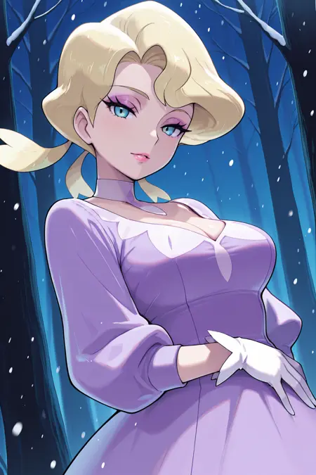 보라색 드레스, 초크 목걸이, 흰 장갑, 풍성한 소매, 긴 소매