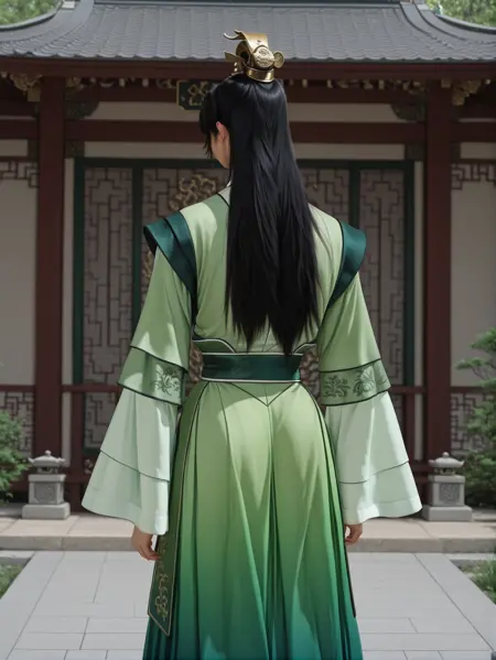 mgz, solo, black hair, hanfu, headpiece, long hair, realistic, long sleeves, pendant, gradient dress, wide sleeves