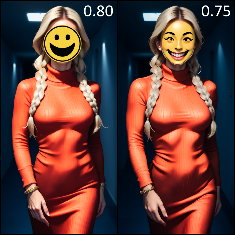 这个 Stable Diffusion LoRA 会将图片中的人脸替换为一致的 😊 笑脸表情符号。它是对审查政策和匿名性的一种被动评论。该模型能非常精准地识别人脸(最佳强度为 0.8-0.85)。它是在 60 张女性图片(包括 SFW 和 NSFW)上训练的,但同样适用于男性图片。如果你使用较低的强度,面部可能会呈现出人物与黄色表情符号的混合效果,这很有趣,你可以在提示词中加入 "黄色面部" 来辅助这种混合。如果你在提示词中描述了眼睛、妆容等内容,表情符号的显现效果可能会减弱。