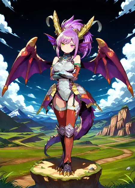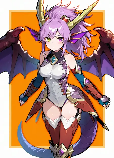 Trigger words and recommended prompts: soniapyd, 1girl, head fins, bare shoulders, dragon_girl, dragon_horns, dragon_tail, dragon_wings, armored gloves, fingerless_gloves, heterochromia, large horns, armored leotard, medium breasts, long hair, purple hair, purple wings, red thighhighs, armored boots with claws, garter straps