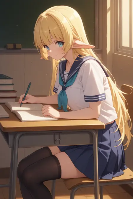 aashera, 尖耳朵, 蓝眼睛, 金发, 长发, sheradef, 绿色发带, 金属项圈, 绿色小披肩, 绿色连衣裙, 露胸剪裁, 无袖连衣裙, 短款连衣裙, 肘部手套, 白色手套, 棕色腰带, 白色大腿靴,