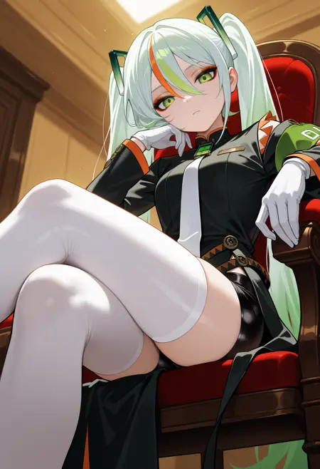 Default Outfit: visor cap, black coat, side slit, white necktie, long sleeves, single detached sleeve, green armband, white gloves, black shorts, bike shorts, white thighhighs, sneakers