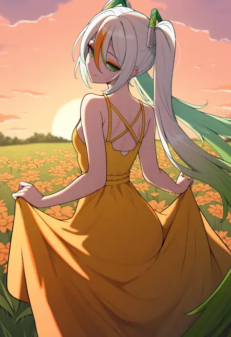 Appearance: eyeshadow, long hair, streaked hair, gradient hair, white hair, orange hair, green hair, hair between eyes, twintails, green eyes