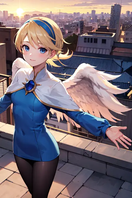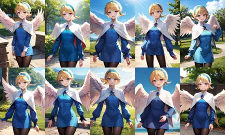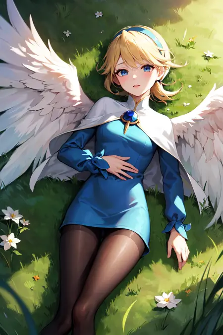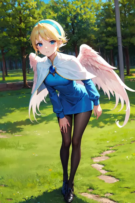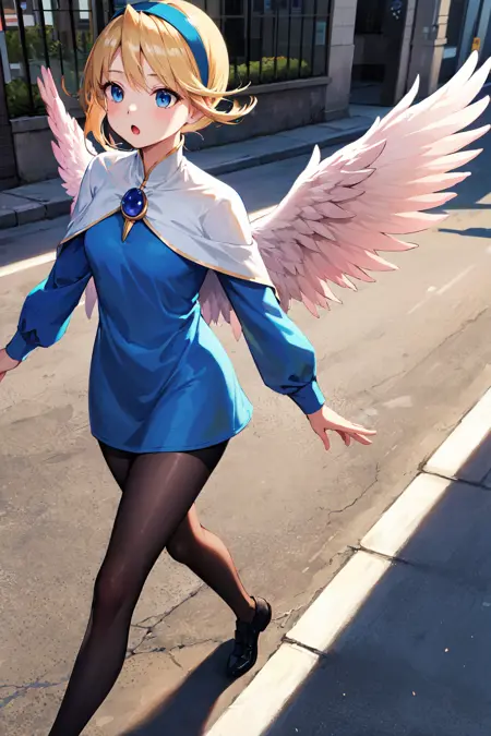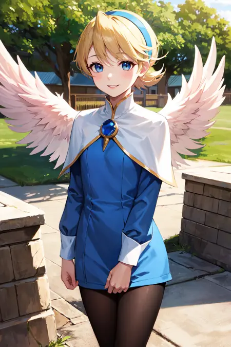 ddnina, blonde hair, short hair, swept bangs, hairband, blue eyes, angel wings, white wings, white capelet, brooch, blue dress, long sleeves, black pantyhose