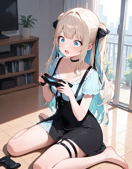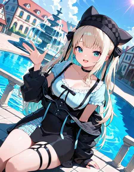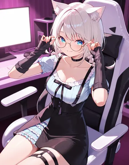 "choker, short sleeves shirt, arm warmers, suspender layered skirt, thigh strap"