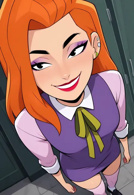 タグ:daphneHBO, オレンジ色の髪、長い髪、メイク、リップスティック、黒い目、イヤリング、ジュエリー、ピアス、紫のドレス、膝丈ソックス、緑のリボン、黒い靴、白い襟、黒い眉毛