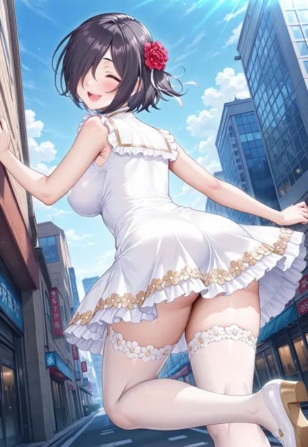 4번 옷차림: 머리 장식 꽃, 빨간 꽃, 머리 장식, 흰 드레스, 금색 액센트, 플로럴 트림, 소매 없음, 가슴 사이 벌어짐, 흰색 허벅지 스타킹