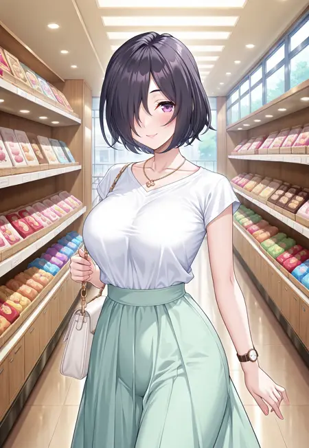 태그: 시시무라 코로, 짧은 머리, 검은 머리, 한쪽 눈 위의 머리, 보라색 눈, 약간 윤기 나는 입술, 중간 크기의 가슴, 큰 가슴