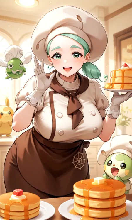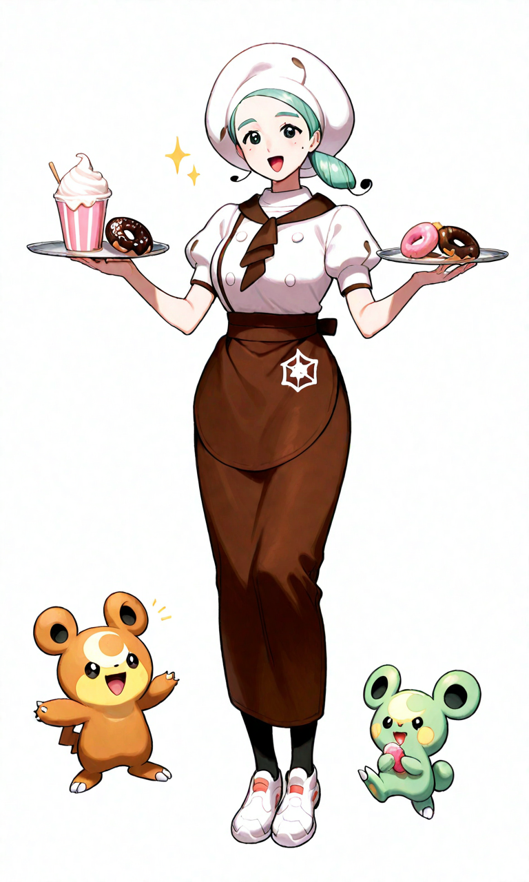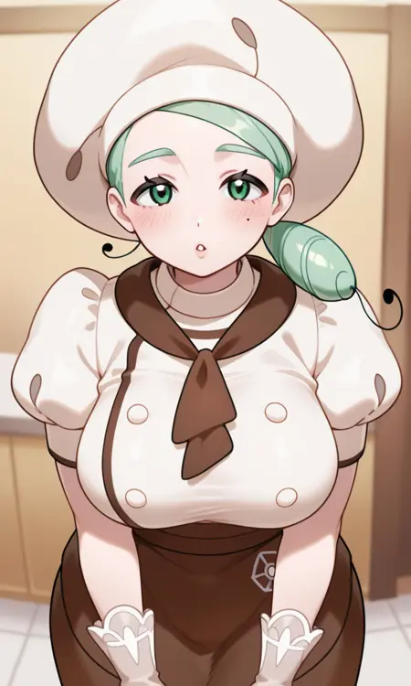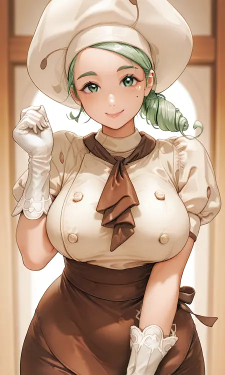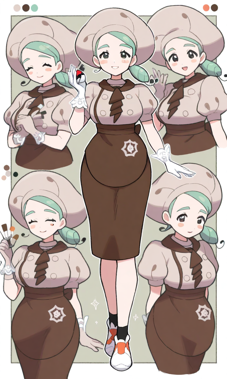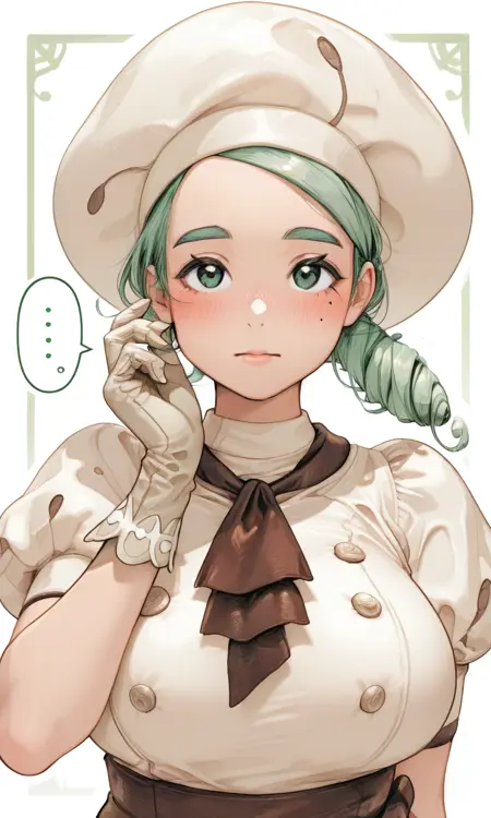 kaede (포켓몬), 포켓몬 스카렛 및 퍼플, 오른쪽 귀 근처 모자 아래에서 새어나오는 작은 연한 녹색 머리카락, 아쿠아마린색 머리카락을 꼬아 묶음, 아쿠아마린색 눈, 왼쪽 볼의 점, 베이커 베레모, 은은한 갈색 디테일,