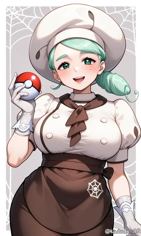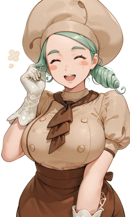 kaede (pokemon), pokémon scarlet and purple, small curl of light green hair peeking out from under the hat near her right ear, aquamarine hair tied in a braid, aquamarine eyes, mole on her left cheek, baker's beret, subtle brown details,