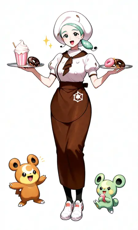 Baking attire, beige beret, beige shirt, dark brown details, antenna shapes, Vivillon, beige gloves, white details, dark brown scarf, dark brown long skirt, cotton texture, dark brown apron, print Spiderweb apron, white sneakers.