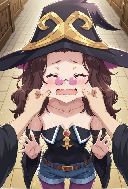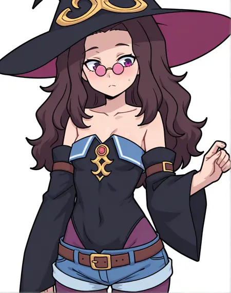 프롬프트: Megumi-Liver020, 1명의 소녀, 혼자, 분홍색 톤의 안경, 갈색 머리, 보라색 눈, 톤이 있는 안경, 작은 가슴, 파란 머리, 안경, 마녀 모자, 검은 마녀 모자, 장식, 분리된 소매, 검은 소매, 넓은 소매, 쇄골, 보라색 팬티스타킹, 짧은 반바지, 갈색 벨트, 스트랩리스, 청바지 반바지, 검은 바디수트, 검은 셔츠