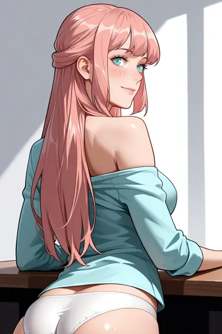 トリガー:daji、長い髪、ピンクの髪、前髪、ハーフアップ、水色の瞳、白いローブ、緑のドレス、胸元、長い袖、広い袖、赤いベルト、ベルトリボン