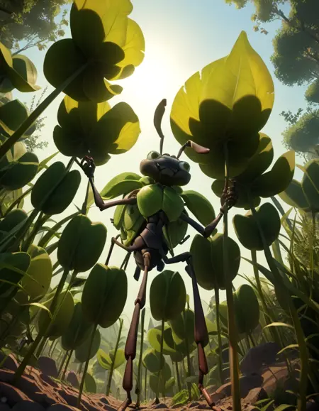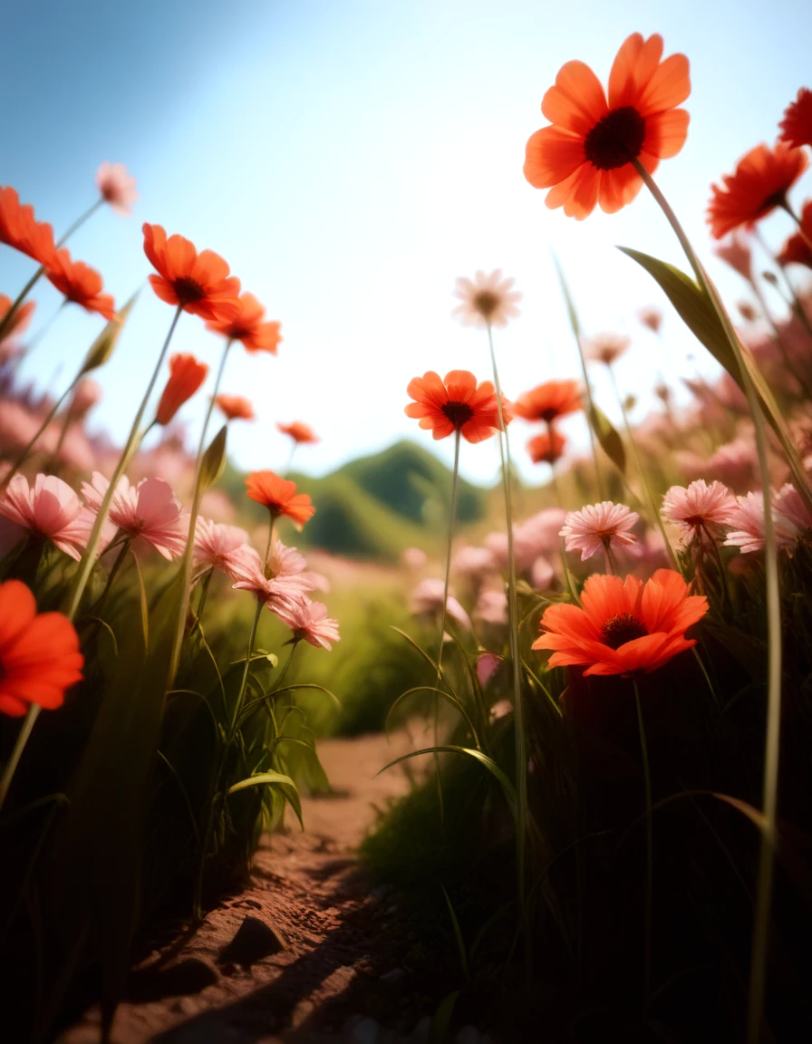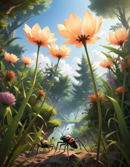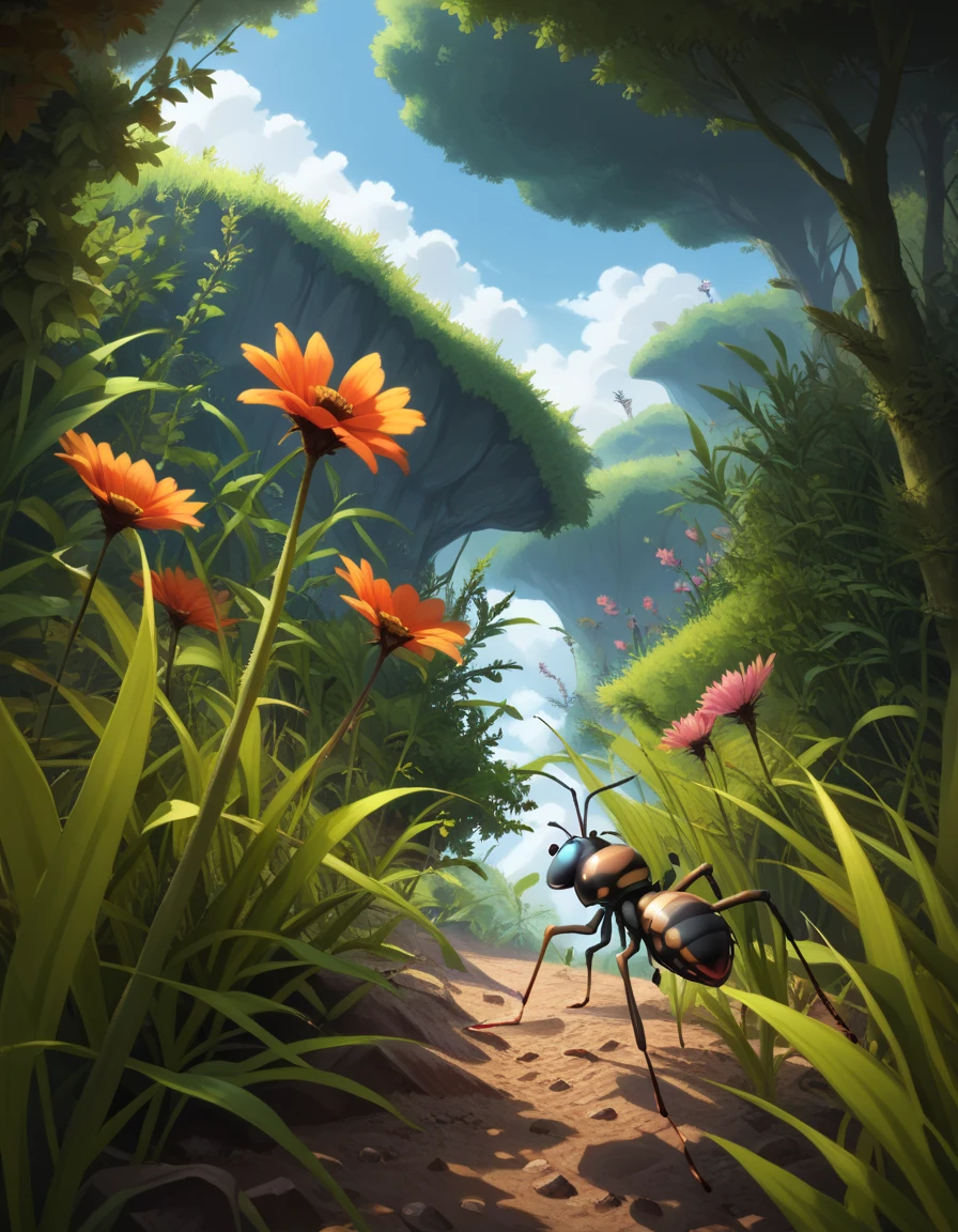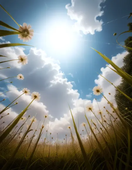 no humans, scenery, day, sky, nature, flower, tree, blue sky, cloud, grass, forest, sun, bug, depth of field, flower field