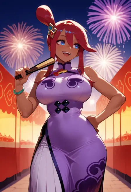 2022年記念日: dark-skinned female, sidelocks, hair between eyes, one side up, hair ornament, blue eyes, eyelashes, purple dress, china dress, sleeveless dress, side slit, long skirt, white skirt, pleated skirt, bracelet, bare shoulders